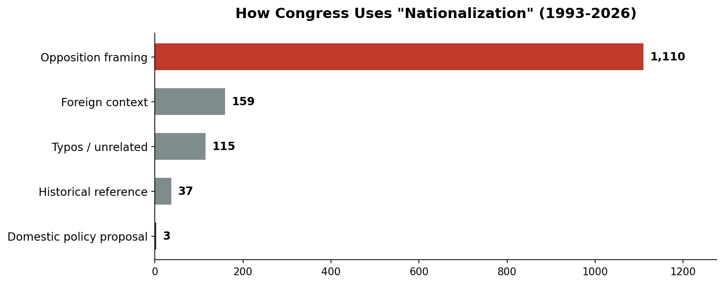 Opposition framing is by far the largest category, at 1,109 out of 1,424 classified results. When members of Congress use “nationalization” or “government takeover” in relation to domestic policy, it is overwhelmingly an accusation, e.g., the other side is trying to nationalize healthcare, banks, or education.