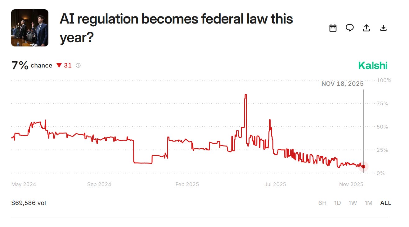 “Polymarket [still] shows an 8% chance of the US enacting an AI safety bill by December 31st, 2025,” meaning a legislative breakthrough is unlikely during the current Congress. “That is right where I’d put my own subjective estimate…”