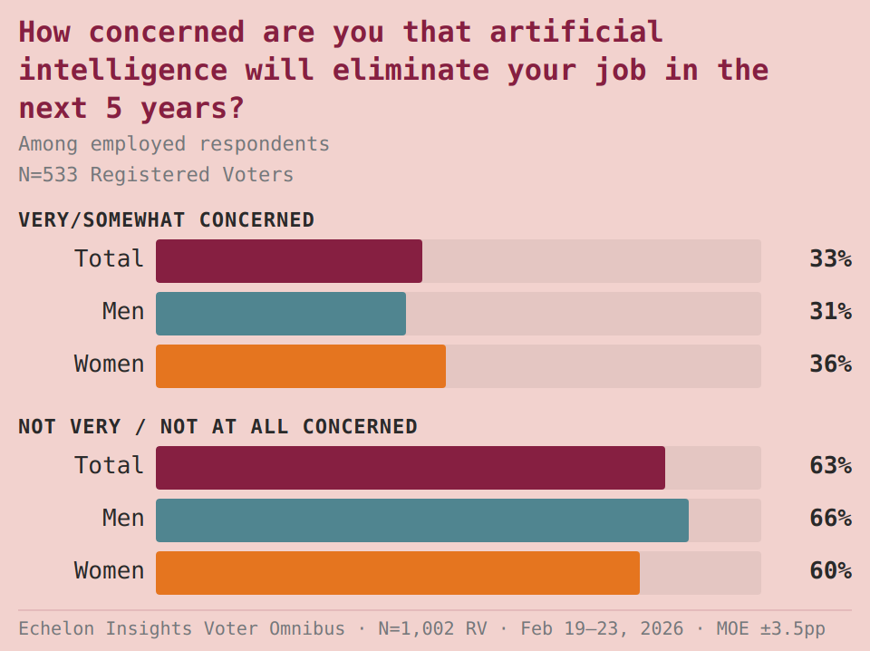 Surprisingly, a full 63 percent of employed respondents to the voter survey are not very or not at all concerned that AI will eliminate their job sometime in the next five years. This stands in marked contrast to some technologists, especially those from frontier labs like Anthropic and OpenAI, who often say they expect mass AI-driven job loss in the years ahead.