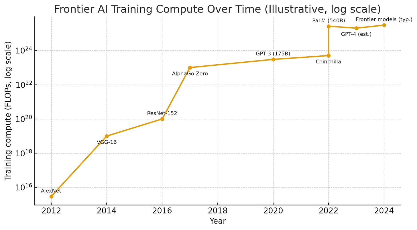 Readers of Byrne Hobart and Tobias Huber’s Boom: Bubbles and the End of Stagnation will be familiar with the dynamic whereby frothy initial investment precedes more stable long-run growth. Technological revolutions test the limits of standard models and paradigms, but the initial frenzy heralds a new era of investment and diffusion — for railroads, the internet, and now likely AI. “The dot-com bubble looked like the peak of delusion,” writes Peter Thiel, “but the truly deluded were those who wanted to indefinitely defer the future.” Looking at the growth in training compute for AI models over the last decade, you might see a similar dynamic emerging.